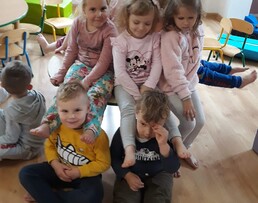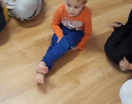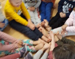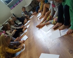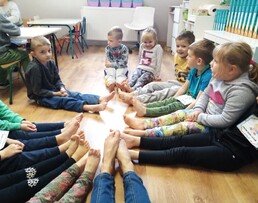 Środowy dzień stał przed przedszkolakami pod znakiem zabaw z działu sensomotoryki. Tego dnia obchodziliśmy w naszych grupach "Dzień bez skarpetek". Dzieci celebrowały go "na boso". Rozwijały swoje wrażenia dotykowe i stymulowały zmysły tańcząc i chodząc boso po jesiennym torze przeszkód. Zostały dokładnie przeliczone wszystkie palce u stóp. Nie mogło zabraknąć również rysowania właśnie - stopami ….