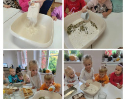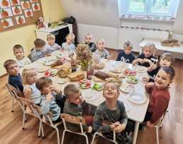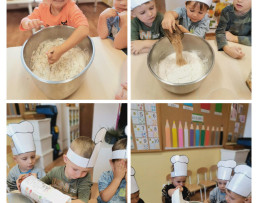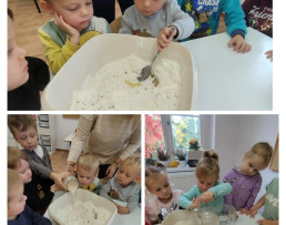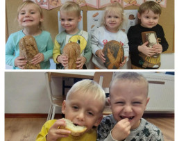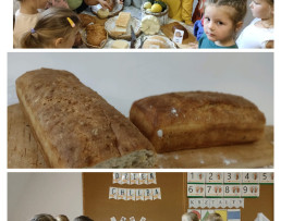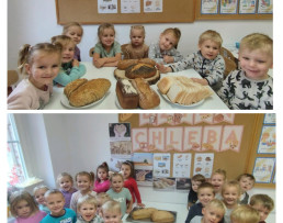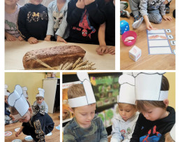 W czwartek 19.10.2023r. nasze zajęcia rozpoczęliśmy od wyjaśnienia zagadki, jak powstaje chleb. Przedszkolaki z każdej grupy z zainteresowaniem słuchały opowieści „Od ziarenka do bochenka”, aż wreszcie przyszedł czas na część praktyczną. Poznając tajniki wypieku chleba, wykorzystaliśmy wszystkie nasze zmysły. Dotykaliśmy ziaren pszenicy, żyta, owsa; odróżnialiśmy mąkę żytnią od pszennej.