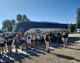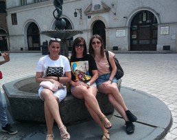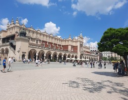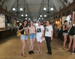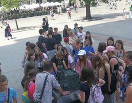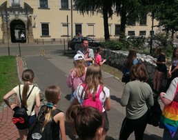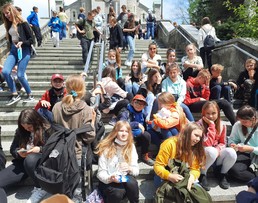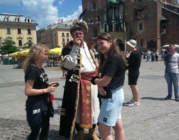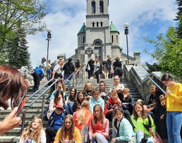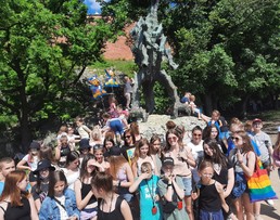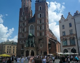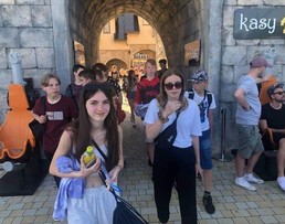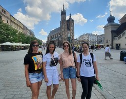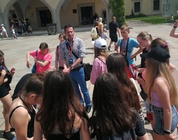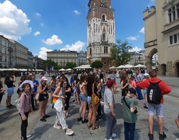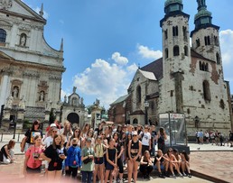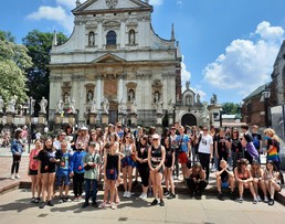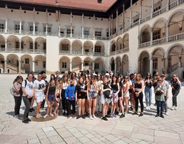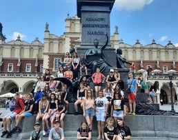 Kraków. Kraków zwiedzaliśmy w pełnym słońcu. Przewodnik oprowadził nas po Trakcie Królewskim, przekazał ciekawostki o Wawelu, jego mieszkańcach. Przy okazji przepytał uczniów ze znajomości ważnych wydarzeń historycznych związanych z Krakowem. Niektórzy zapunktowali! Zwiedziliśmy Sukiennice, byliśmy pod oknem Papieskim, zobaczyliśmy miejsce, w którym mieszkał niegdyś patron naszej szkoły. Na końcu odwiedziliśmy Smoka Wawelskiego. Były pamiątki, zdjęcia, krakowskie obwarzanki. Pełni wrażeń ruszyliśmy w drogę powrotną. Nie możemy doczekać się niespodzianki, którą będzie relacja z drona z pobytu na wycieczce. Taki gratis od naszego kierowcy pana Bartka.