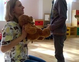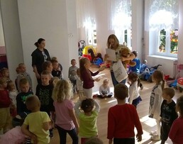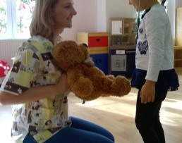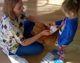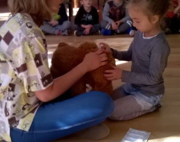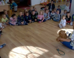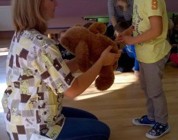 Dodatkową atrakcją okazała się niespodzianka przygotowana przez gościa, który przyniósł do przedszkola misia. Weterynarz zaprezentował przy pomocy misia jak należy sprawdzić stan zdrowia zwierzątka, pokazując przy tym wszystkie niezbędne do wykonywania tej czynności przyrządy lekarskie. Po krótkiej prezentacji dzieci mogły z pomocą Pani Natalii posłuchać bicia serca, zrobić zastrzyk oraz zabandażować łapkę misiowi.