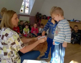 Dnia 4 października obchodzony jest Światowy Dzień Zwierząt. W związku z tym zaprosiliśmy do naszego przedszkola Panią Natalię Cielińską, lekarza weterynarii z Przychodni Weterynaryjnej Vetka w Słupsku. Podczas spotkania Pani Natalia w prosty i zrozumiały sposób opowiedziała o swojej pracy polegającej na leczeniu zwierząt, ale również ich prawidłowej pielęgnacji i o bezpiecznych kontaktach ze zwierzętami.