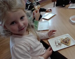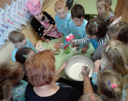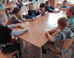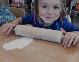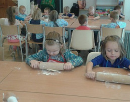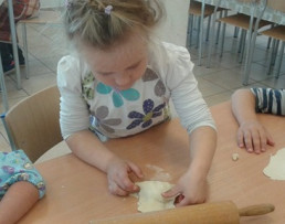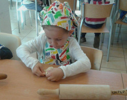„Kuchcikowo” to cykl zajęć, które rozpoczęły się w przedszkolu w poniedziałek 2 października. Dzieci miały możliwość przygotować różne smakowitości: pierogi, makaron, gofry. Podczas zajęć, przedszkolaki usprawniały się manualnie poprzez: krojenie, ugniatanie, mieszanie, smarowanie. Nabywały nowych doświadczeń i doskonaliły czynności związane z samoobsługą.