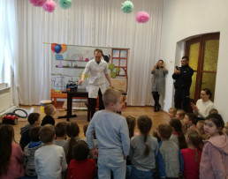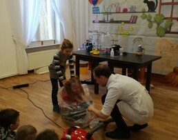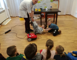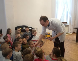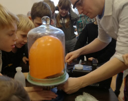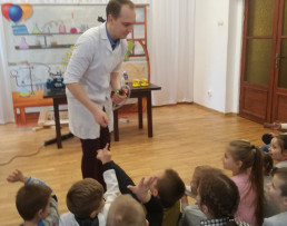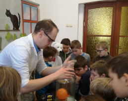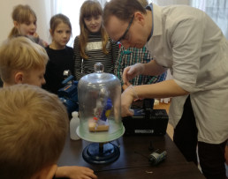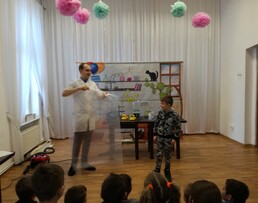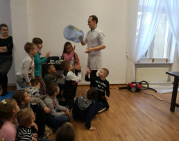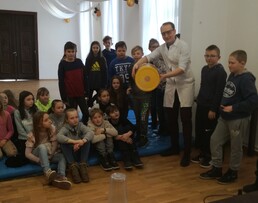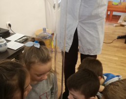 Dnia 25 stycznia odwiedził nas Doktor Vow. Na początku opowiedział nam o chemii oraz co to jest próżnia i jak działa na człowieka. W pierwszym doświadczeniu Doktor Vow pokazał nam jak działa grawitacja za pomocą blaszki, piórka i szklanej rurki. Po tym nasz chemik stworzył próżnię wewnątrz szklanej rury. Poprosił nas abyśmy zobaczyli co spadnie pierwsze: blaszka czy pióro. Okazało się że spadły równocześnie. W drugim doświadczeniu zobaczyliśmy jak działają półkule magdeburskie. Z pomocą siły próbowaliśmy rozłączyć te półkule. Następnym doświadczeniem była armata powietrzna, za pomocą której strzelaliśmy do plastikowych kubeczków. Zobaczyliśmy i doświadczyliśmy jak próżnia działa na człowieka. Wchodziliśmy do worka, z którego Doktor Vow wysysał odkurzaczem z worka powietrze. Poczuliśmy się jak w kosmosie.Ostatnim doświadczeniem był "Dżina" którego stworzyła z etanolu i ognia. Na zajęciach doświadczyliśmy wielu zjawisk i dowiedzieliśmy się ciekawych rzeczy związanych z chemią.
