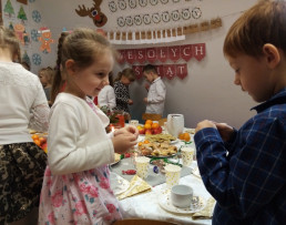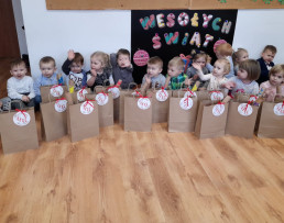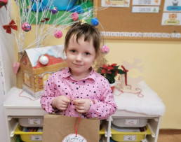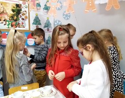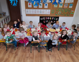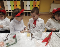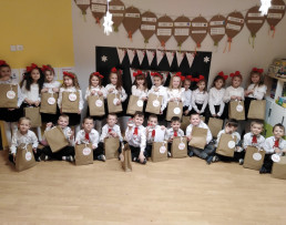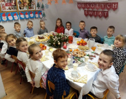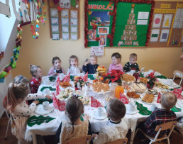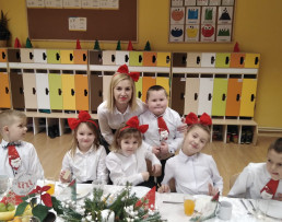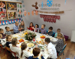 Świąteczny nastrój podkreślały bożonarodzeniowa dekoracja, blask świec i płynące z głośników kolędy. Spotkanie Wigilijne w przedszkolu to podniosła chwila. Dzieci nie tylko utrwaliły sobie znajomość tradycji i zwyczajów świątecznych, lecz co najważniejsze, wzmocniły bliskie i serdeczne relacje.
