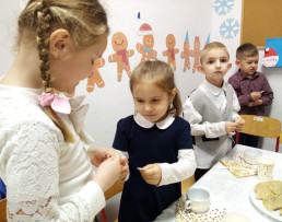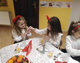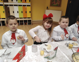 Wszystkie przedszkolaki w tym dniu były odświętnie ubrane i z niecierpliwością oczekiwały na wspólny, wigilijny poczęstunek przygotowany przez rodziców. Wspaniałym momentem było dzielenie się opłatkiem i składanie sobie świątecznych życzeń.