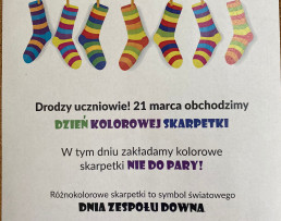 21 marca 2022 r. obchodziliśmy DZIEŃ KOLOROWEJ SKARPETKI. Ludzie na całym świecie okazują poparcie dla akcji, zakładając kolorowe niepasujące do siebie skarpetki, tym sposobem pamiętamy, że tego dnia przypada Światowy Dzień Osób z Zespołem Downa. Te niepasujące do siebie skarpetki mają symbolizować niedopasowane chromosomy. Celem naszej akcji było podniesienie świadomości wśród naszych uczniów na temat życia i potrzeb osób z zespołem Downa. Bardzo duża grupa uczniów i nauczycieli przyłączyła się do akcji.